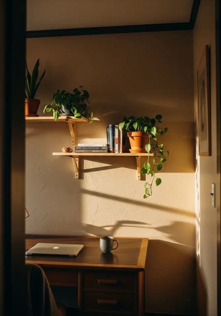 This small recessed office nook features a warm greige tone that softly wraps the walls and enhances the cozy layout. A simple wooden desk sits below a floating shelf filled with greenery, adding life and texture. The sunlight coming through the doorway casts beautiful shadows that highlight the subtle depth of the paint color.