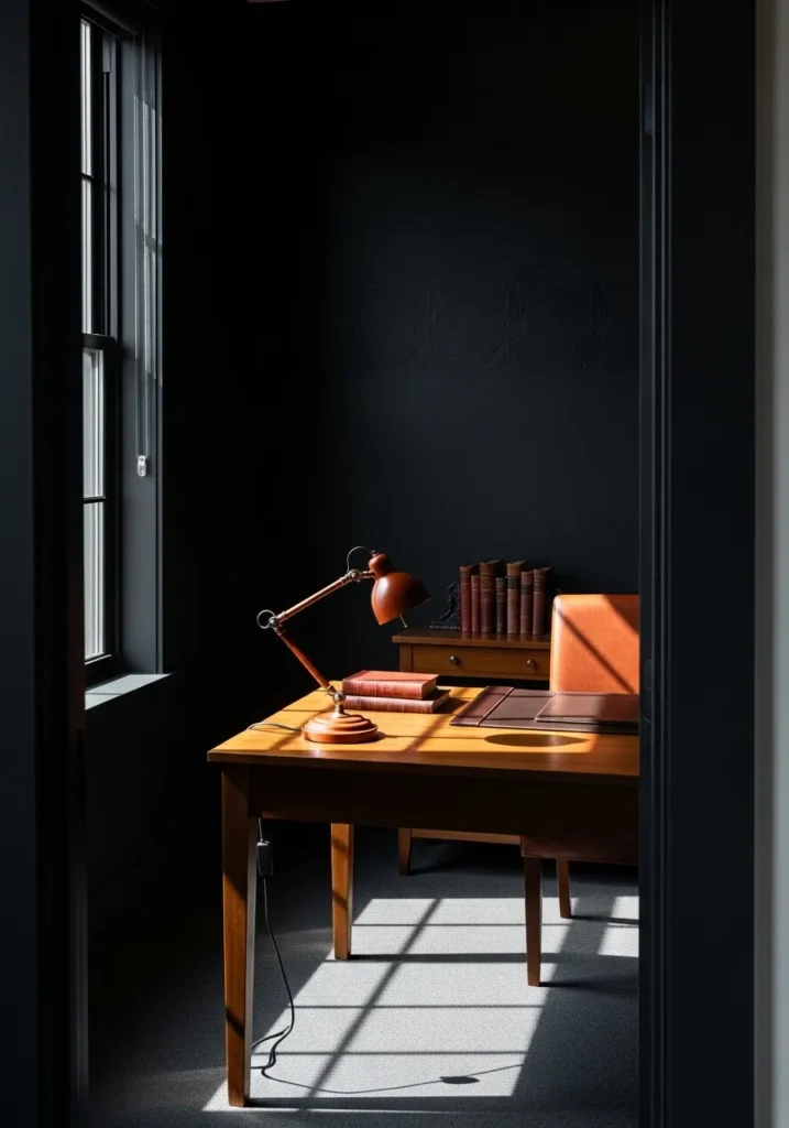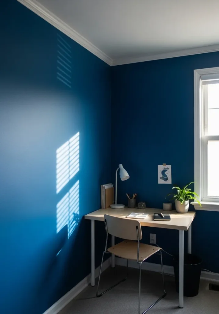 This tiny office space embraces a bold deep navy that creates a dramatic and intimate setting. The dark walls contrast beautifully with the warm wooden desk and copper toned desk lamp. Light from the window cuts across the room, creating striking shadows that emphasize the richness of the color.