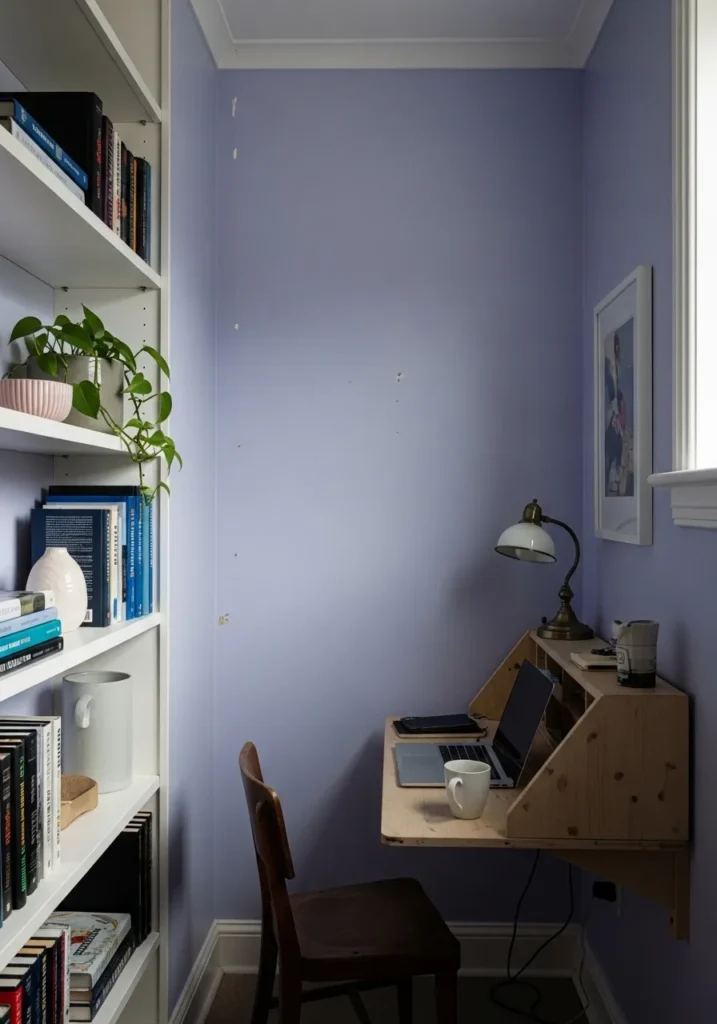 This narrow office alcove is painted in a gentle lavender that instantly softens the entire space. The slim wall mounted desk keeps the footprint light, while open shelving adds practical storage without crowding the walls. A small wooden chair and simple task lamp give it a slightly vintage feel. Natural light from the nearby window brightens the cool undertones in the paint, making the room feel calm and airy.