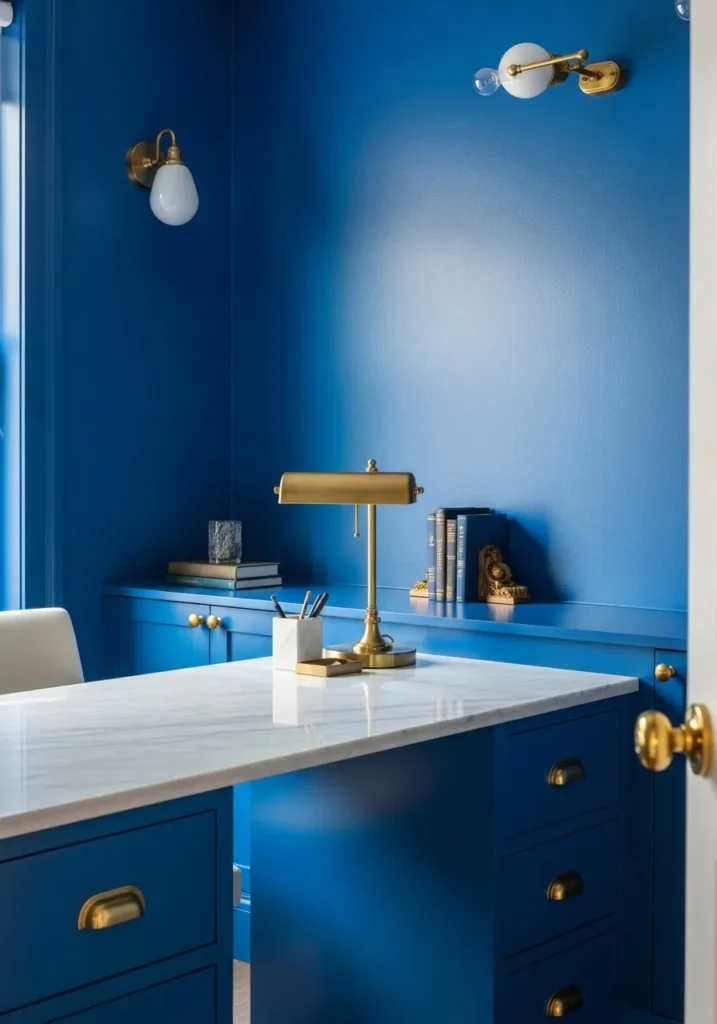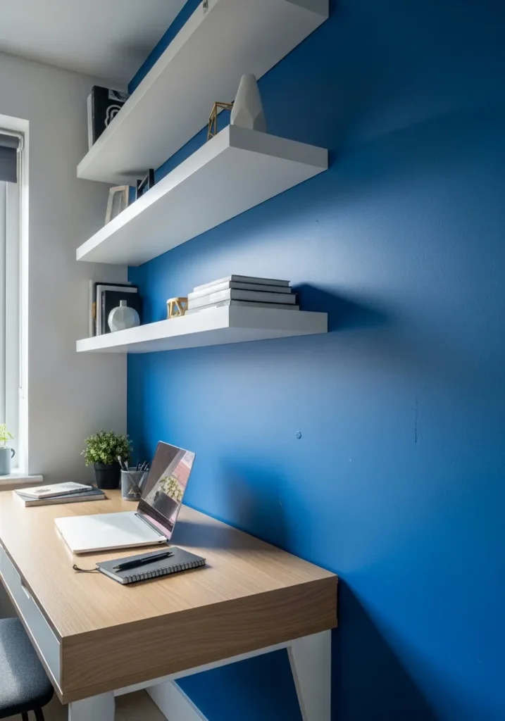 This small office corner features a striking cobalt blue accent wall that instantly grabs attention. The crisp white floating shelves pop against the saturated color, creating strong contrast and visual interest. A simple wooden desk keeps the look grounded, while natural daylight brightens the blue and shows off its depth. The layout is clean and practical, yet the color choice makes it unforgettable.