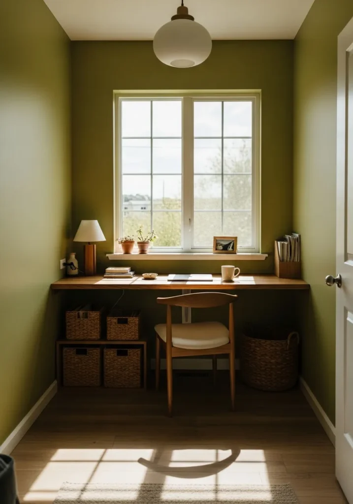This small office is painted in a grounded olive green that pairs beautifully with warm wood furniture. The desk sits beneath a bright window, letting sunlight highlight the earthy tones in the walls. Simple decor and woven textures keep the look relaxed and inviting. The layout feels practical and balanced, with just enough storage to stay organized.