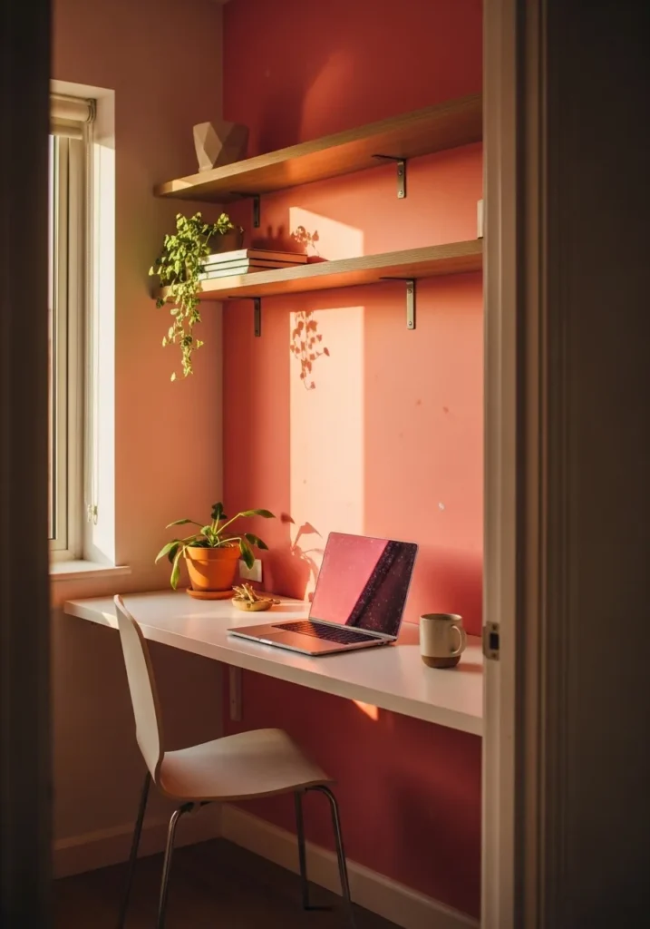 This tiny office space features a lively coral pink that adds instant personality. The floating shelves and slim desk keep everything streamlined, while small plants and decor pieces bring softness. Sunlight hitting the wall creates warm shadows that make the color look even richer. The overall effect is cheerful but still polished.