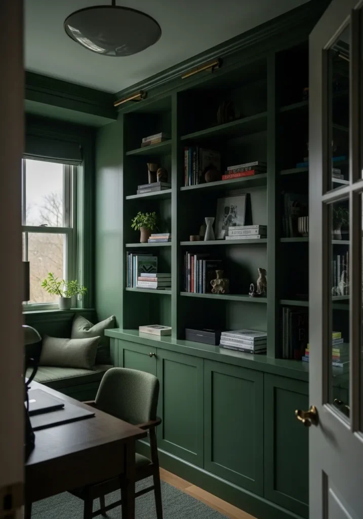 This dramatic office is wrapped in a rich forest green across its built in shelves and cabinetry. The darker tone gives the space a cozy library feel, especially paired with classic wood furniture and layered decor. Natural light filtering in from the window keeps the room from feeling too heavy and highlights the depth of the green.