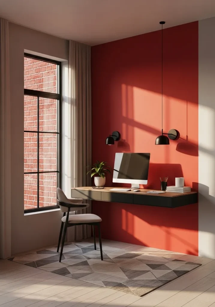 This compact office features a bold red accent wall that instantly energizes the room. The crisp white desk and light flooring create strong contrast, making the red feel vibrant but controlled. Sunlight streaming through the window enhances the warmth of the color and creates beautiful geometric shadows on the wall.