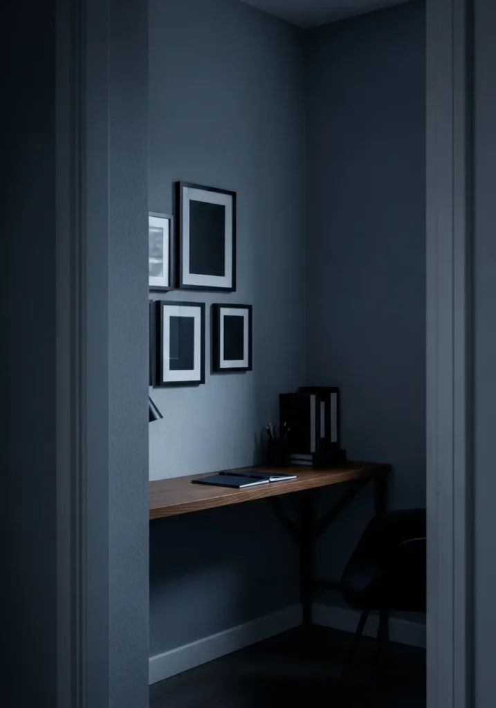 This small office nook is painted in a smoky blue gray that feels calm and modern. The color wraps the narrow walls and creates a subtle cocoon effect without feeling too dark. A floating wooden desk keeps the footprint light, while a few black framed prints add contrast and structure. The soft daylight from the nearby window highlights the cool undertones in the paint and gives the room a polished finish.
