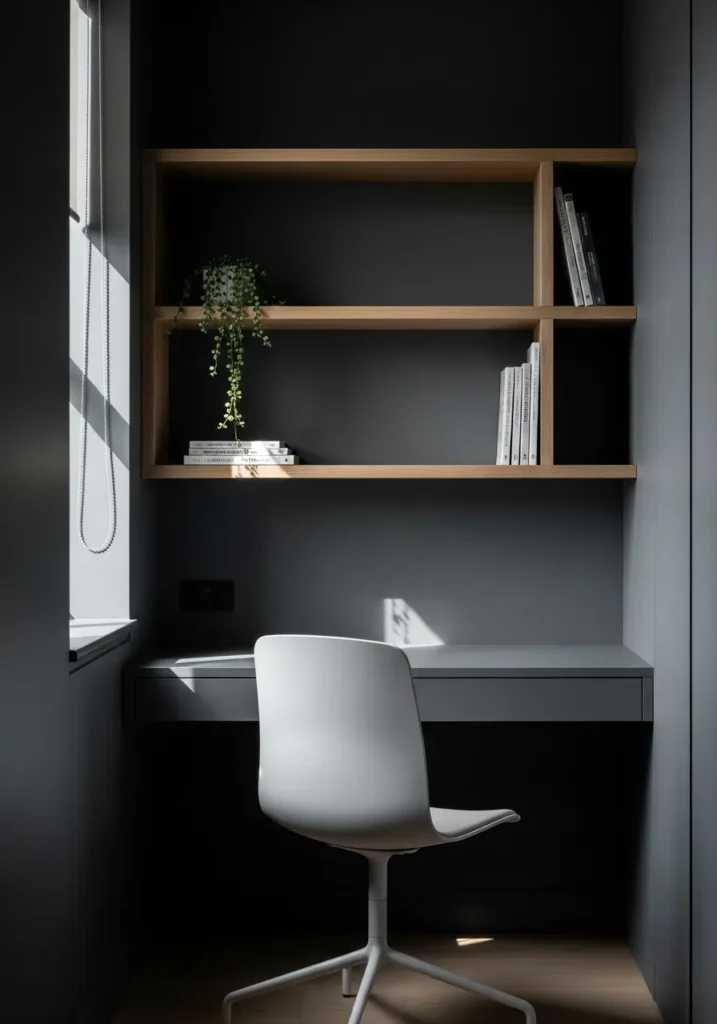 This narrow office nook uses a deep charcoal gray to create a cocoon like effect that feels calm and sophisticated. The built in wooden shelves break up the dark wall with warm texture, while the slim desk fits perfectly beneath the window. Natural light pours in from the side, softening the bold paint color and casting gentle shadows across the space. A simple white chair keeps the look fresh and modern against the darker backdrop.