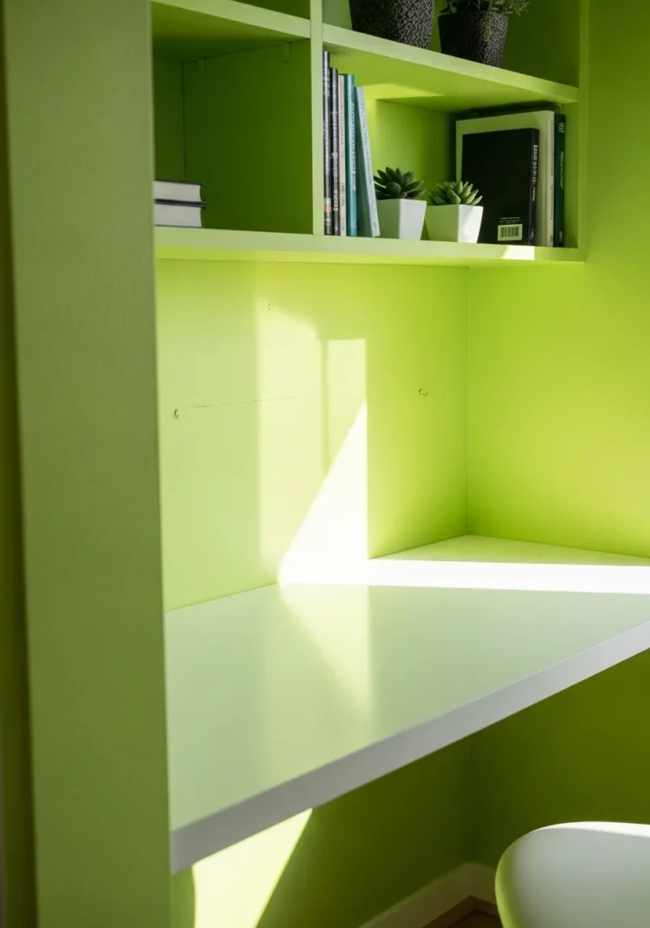 This tiny built in desk area is wrapped in a striking lime green that demands attention in the best way. The glossy white desk and shelves pop sharply against the vivid backdrop, creating a high contrast look that feels fresh and modern. Natural light bouncing off the walls makes the color glow even more, turning the small space into a lively focal point.