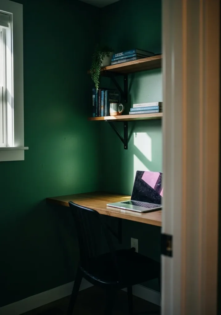 This narrow office nook features a rich emerald green that wraps the walls in dramatic depth. The darker tone pairs beautifully with the warm wood desk and simple black chair. Floating shelves provide storage without cluttering the space, and the nearby window keeps the green looking vibrant instead of heavy. The result is intimate and stylish.