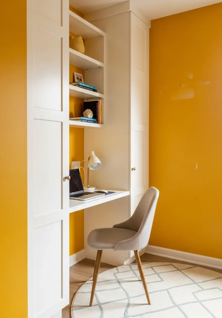 This bright mustard yellow wall instantly energizes the small office corner. The built in white shelving and compact desk keep the layout clean and functional, while the bold color brings warmth and personality to an otherwise simple setup. The light tiled floor and soft daylight from the window stop the yellow from feeling too heavy, so the room still feels open and airy.