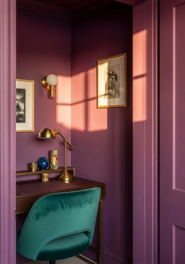 This compact office niche is painted in a rich plum tone that feels dramatic and cozy all at once. The color wraps around the walls and trim, creating a jewel box effect that makes the small space feel intentional. A classic wooden desk and brass wall sconce add warmth and elegance, while the green velvet chair brings in a soft pop of contrast. Sunlight filtering in creates beautiful shadows that highlight the depth of the paint.