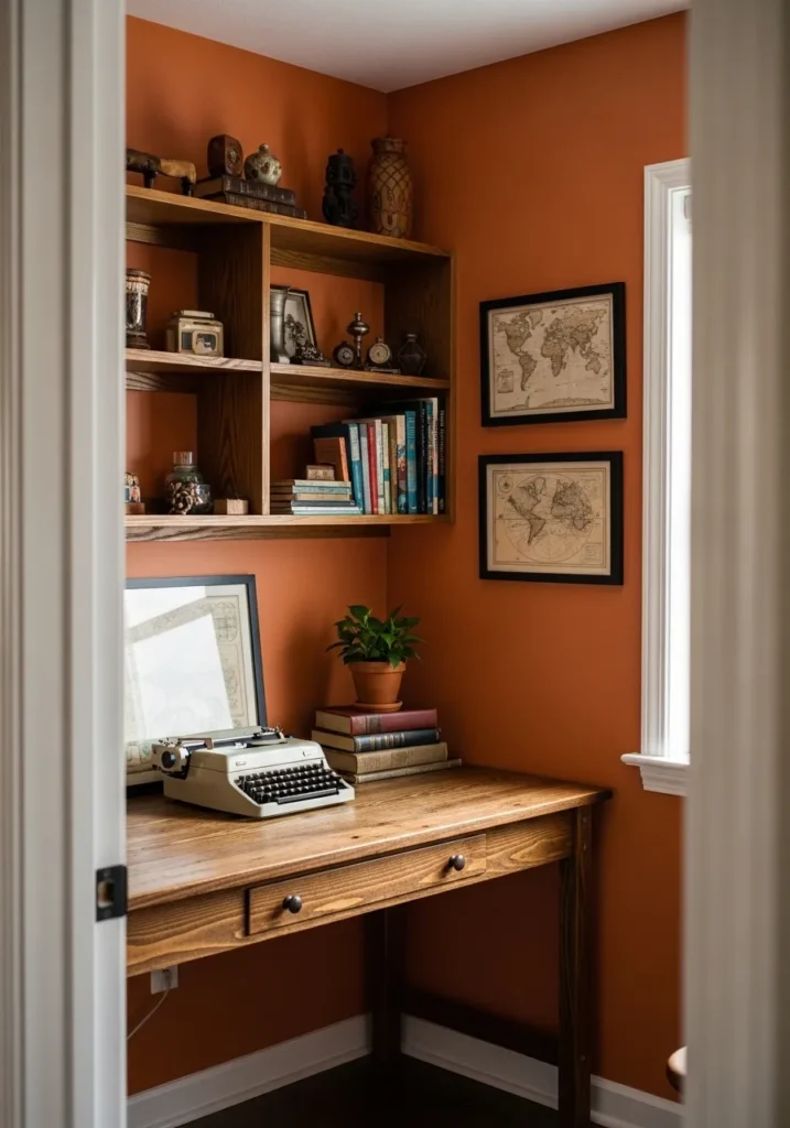 This compact office corner is wrapped in a rich burnt orange that instantly adds warmth and depth. The built in wooden shelves and matching desk blend beautifully with the wall color, creating a cozy and cohesive look. Framed art and small decor pieces bring personality without cluttering the space. Soft daylight from the nearby window keeps the bold shade feeling balanced and inviting rather than heavy.