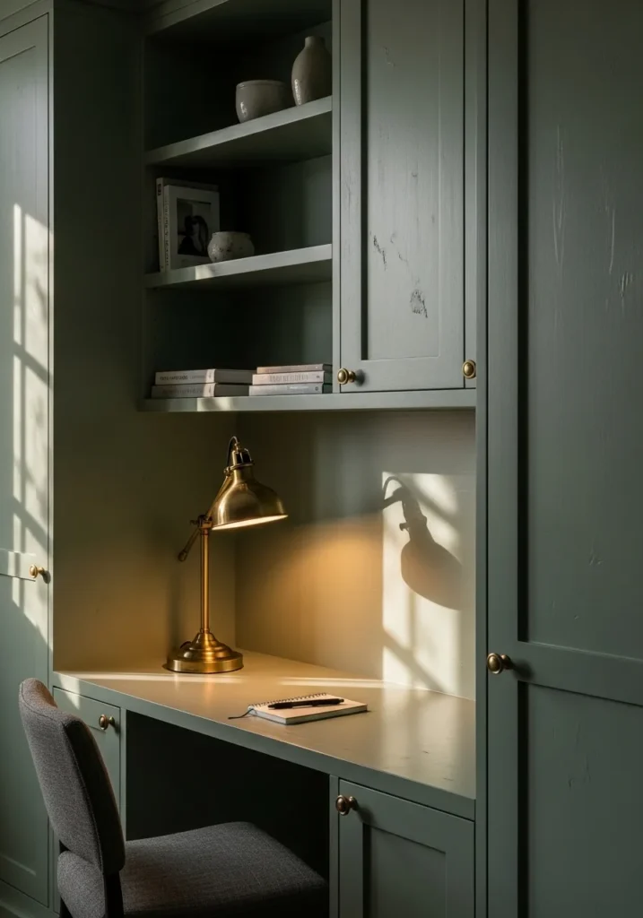 This small office setup features muted sage green cabinetry that wraps around the desk and shelving for a seamless built in look. The color feels calm and refined, especially paired with warm brass hardware and a classic desk lamp. The cabinetry adds storage without overwhelming the room, and natural light highlights the subtle undertones in the green paint.
