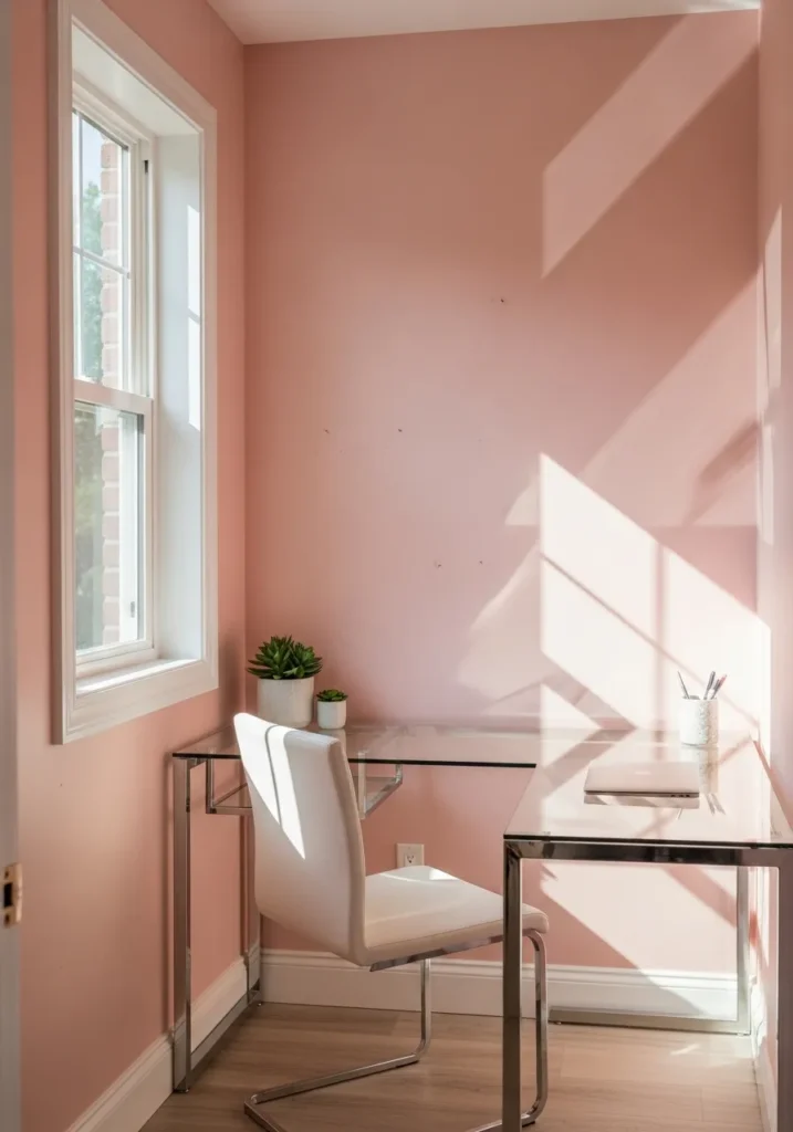 This small office space is painted in a delicate blush pink that reflects light beautifully. The simple glass desk and white chair keep the layout airy and open, while the soft pink walls add warmth and femininity. Sunlight streaming through the window creates gentle shadows across the wall, giving the space a dreamy glow.