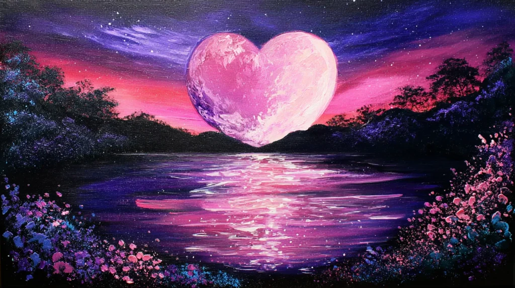 This moody and romantic scene features a giant glowing pink moon in the shape of a heart rising over a dark mountain range. The composition is perfectly balanced with cherry blossom trees framing the sides, while a shimmering pink reflection stretches across the ripples of the lake. Splattered white paint creates a starry night sky, and the artist used horizontal strokes in the foreground to capture the movement of the water under the moonlight.