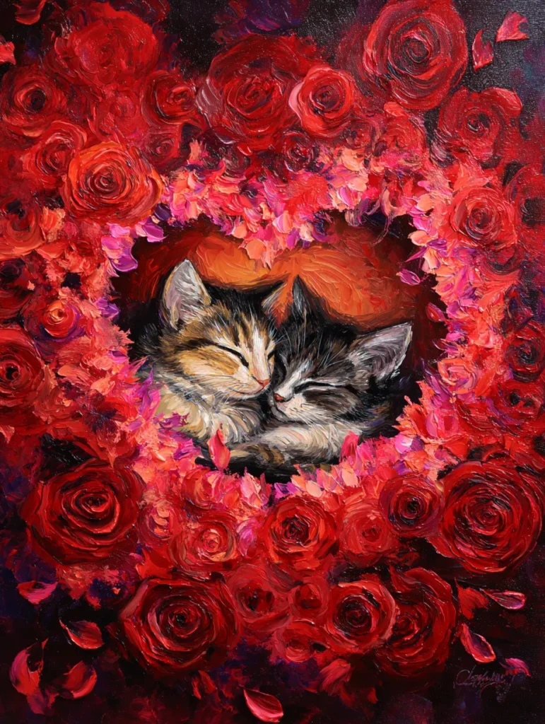 This sweet painting features two tiny tabby kittens napping soundly while curled up together. They are perfectly framed by a thick border of luscious red roses that form a soft heart shape around them. The artist used very thick, circular brush strokes for the flowers to create a heavy texture that contrasts beautifully with the finer, delicate strokes used for the kittens’ fur. Deep crimson and burgundy tones dominate the outer edges, while the center glows with a warm, peachy orange light that makes the scene feel incredibly cozy.