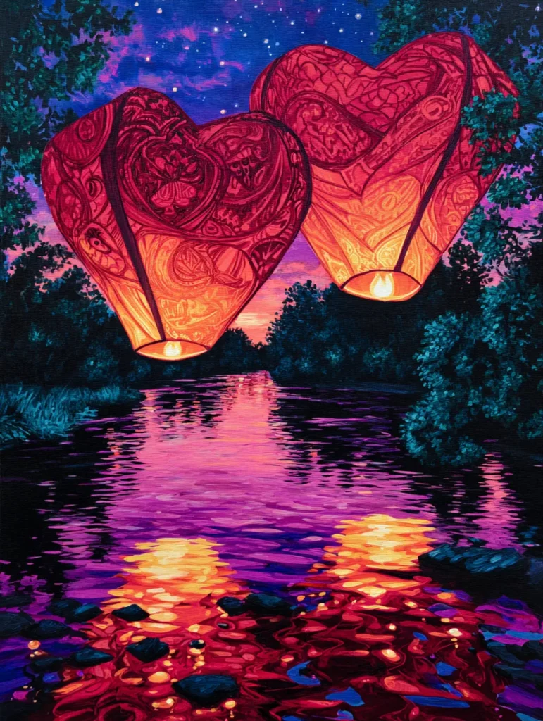 Two large, heart-shaped sky lanterns float gently above a winding river, their paper surfaces covered in intricate, swirling patterns. The lanterns cast a brilliant orange and yellow glow that reflects vividly in the rippling water below, which is painted in deep purples and vibrant magentas. A starry indigo sky and dark, silhouetted trees frame the scene, creating a magical nighttime atmosphere. The artist used short, choppy brush strokes in the water to capture the movement of the light, while the lanterns themselves feature smooth, warm gradients that make them appear to truly radiate heat.