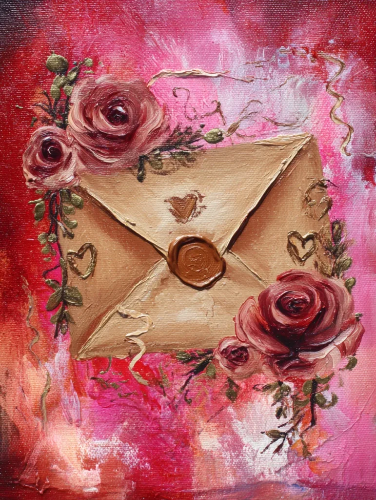This romantic composition centers on a tan, kraft-style envelope secured with a round bronze wax seal and adorned with small golden heart sketches. Clustered in the corners are deeply textured roses in shades of dusty rose and burgundy, featuring thick, swirling brush strokes that give the petals a sculptural quality. The background is a dreamy, abstract wash of hot pink and white with hints of gold leaf and delicate, vine-like linework that frames the letter. The artist used a mix of smooth application for the envelope and heavy impasto for the florals, creating a beautiful tactile contrast across the canvas.