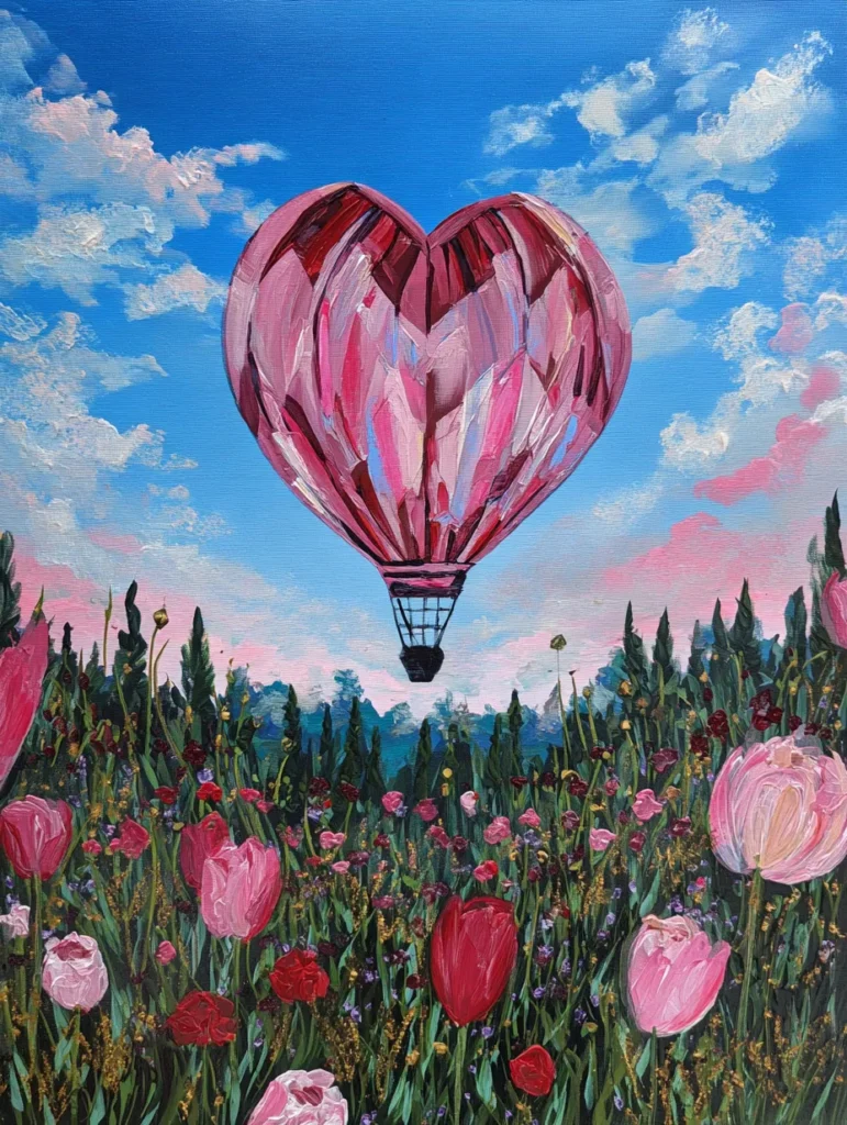 This whimsical design features a large heart-shaped hot air balloon floating gracefully above a lush meadow of pink and red tulips. The artist used thick impasto brush strokes to give the balloon a faceted, almost crystalline look with shades of rose and magenta. The sky is a bright, cheerful blue filled with fluffy white and pink-tinted clouds, while the dark green trees in the background add nice depth to the vertical layout.