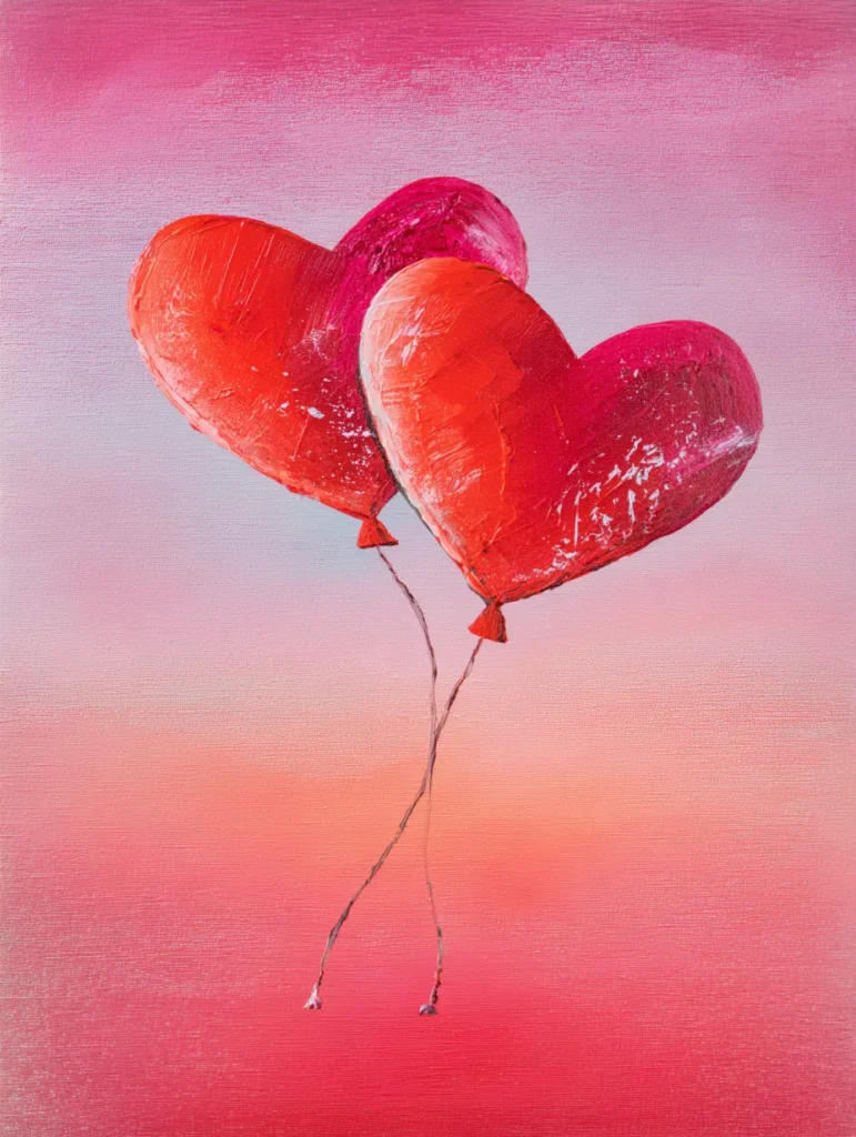 This sweet composition centers on two vibrant red heart balloons with thin, delicate strings that cross at the bottom. The background features a smooth, seamless transition from a deep hot pink at the top to a warm peachy orange toward the base. Heavy texture is the star here as the artist used thick palette knife or brush applications to create a dimensional raised effect on the balloons themselves, giving them a wonderful tactile quality against the soft blended sky.
