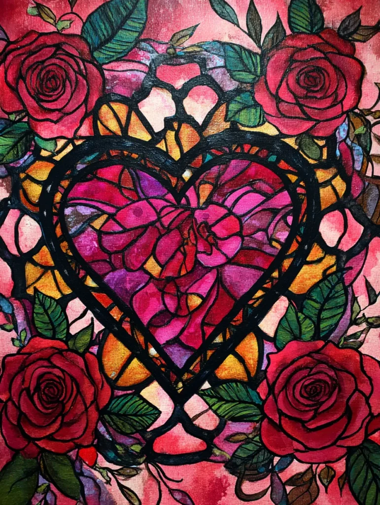 This intricate design mimics the look of a classic stained glass window with bold black outlines defining every petal and leaf. At the center sits a large heart filled with mosaic-like shards of fuchsia and crimson, while golden amber tones glow from behind it. Four lush red roses anchor the corners of the composition, and the background is a wash of textured pinks that makes the entire floral layout pop with a vintage romantic vibe.