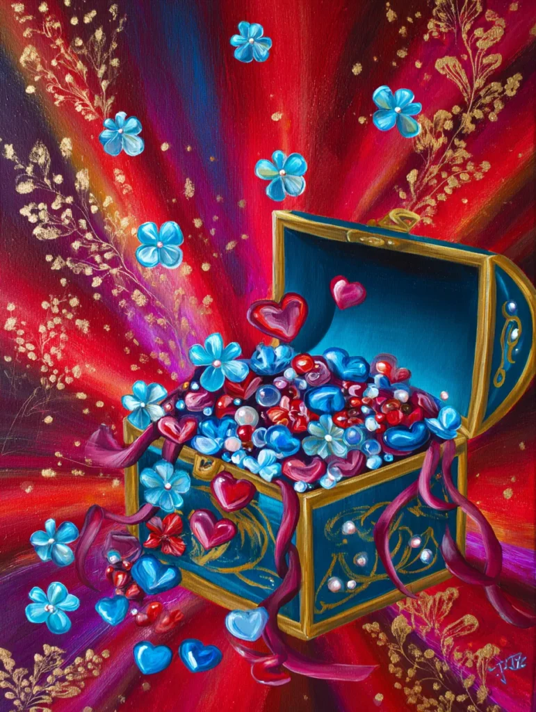 This enchanting design showcases an ornate blue jewelry box overflowing with a mix of tiny red hearts and vibrant turquoise flowers. The background is a dramatic burst of crimson and gold light rays that create a sense of movement as if the contents are magically floating out into the air. Touches of metallic gold paint highlight the delicate floral stems and the box trim, while the soft ribbons draping over the sides add a lovely fluid element to the busy composition.