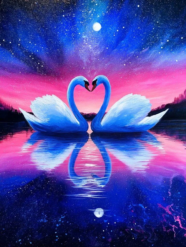 This stunning painting captures two elegant swans meeting in the center to form a perfect heart shape with their slender necks. The background is a breathtaking cosmic display of deep indigos and electric blues that blend into a vivid pink horizon just behind the silhouetted mountains. Feathered brush strokes give the swans a soft, glowing appearance, while the glassy water below provides a crisp mirror reflection of the entire starry galaxy and the bright full moon.