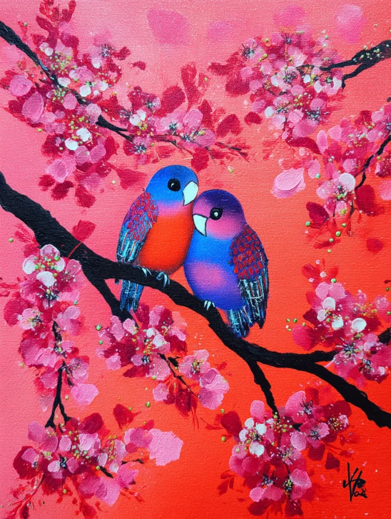 Two colorful birds are perched closely together on a dark, curved tree branch surrounded by clusters of pink cherry blossoms. The background is a solid, punchy coral red that makes the bright blue and purple plumage of the birds really pop. Thick, textured dabs of paint create the fluffy flower petals, while the birds feature smooth gradients and small, detailed markings on their wings. The layout is balanced and charming, focusing on the sweet connection between the two feathered friends.
