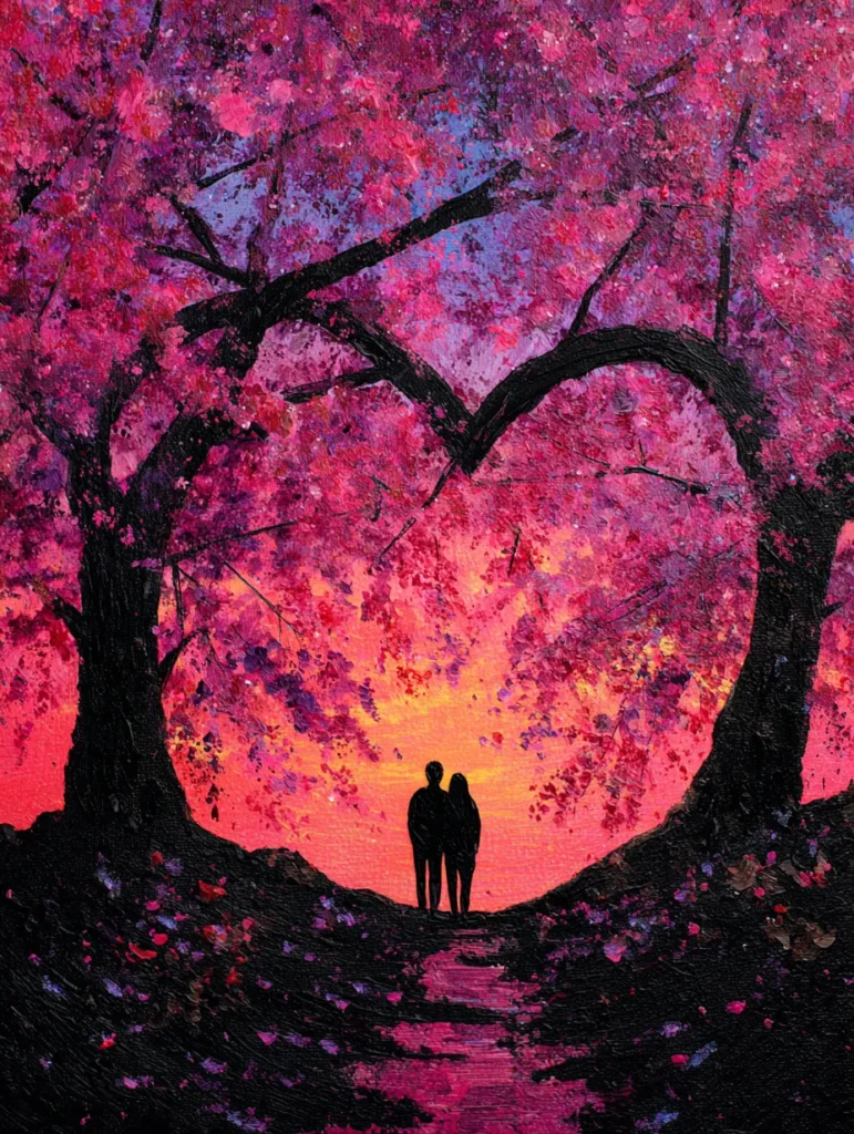 In this atmospheric piece, two dark silhouettes stand hand in hand at the center of a winding path. They are framed by two massive, ancient trees whose thick branches arch toward each other to form a perfect heart shape against a glowing sunset. The canvas is filled with heavy impasto textures, especially in the canopy, where deep violets, magentas, and hot pinks create a dense layer of leaves. The background sky is a fiery orange and yellow, casting a warm light that peeks through the foliage and illuminates the middle of the composition.