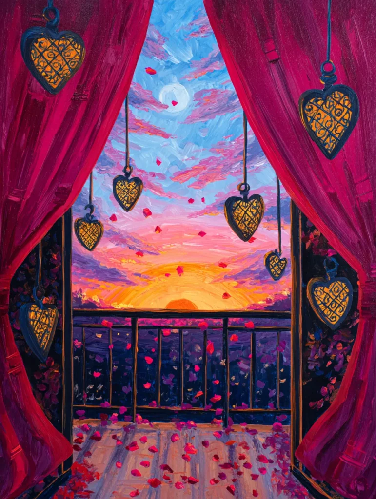 This painting offers a breathtaking perspective from a balcony draped in heavy crimson curtains, looking out over a stunning sunset. The sky is a masterpiece of thick, impasto brushwork, blending bright yellows and oranges into soft lilac and blue clouds. Decorative golden heart lanterns hang from the top of the frame, their intricate latticework glowing against the evening light. Below, the balcony floor and the air are scattered with delicate pink petals, creating a sense of depth and movement within the vertical composition.