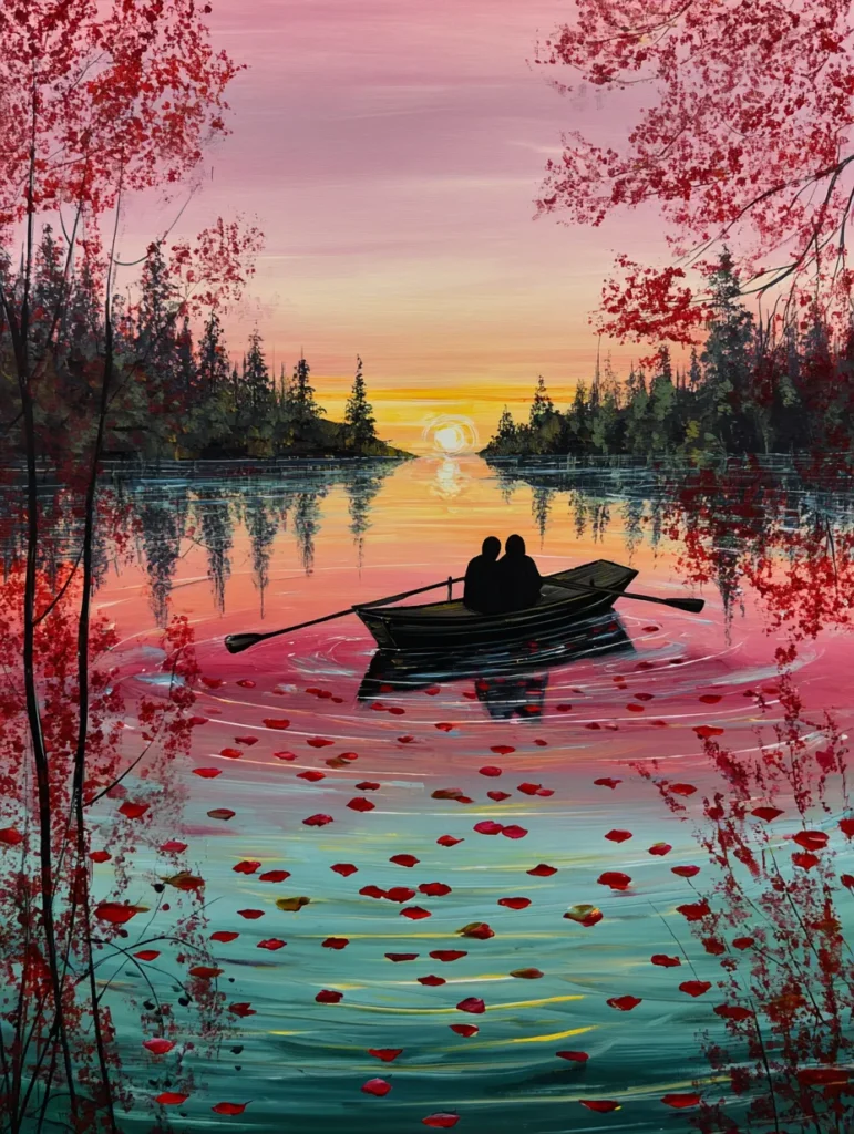 A silhouetted couple sits together in a small rowboat, drifting peacefully toward a glowing sun on the horizon. The water is a stunning mirror of the sky, blending teal and soft pink with scattered red rose petals floating on the surface. Dark, pine-filled shorelines frame the middle ground, while vibrant red autumnal trees lean in from the edges of the canvas. The artist used smooth, horizontal strokes for the sky and water to create a sense of stillness, contrasted by the dappled, textured leaves of the surrounding forest.