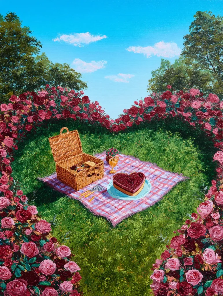 This cheerful scene features a cozy picnic set in a lush green meadow, perfectly framed by a tall hedge of red and pink roses grown into a giant heart shape. A classic woven basket sits open on a pink checkered blanket, accompanied by a heart-shaped cake and a small glass of juice. The artist used stippled brushstrokes to create the soft texture of the grass and the dense clusters of rosebuds, while the bright blue sky and fluffy white clouds add a sense of a perfect summer day. The composition is centered and inviting, drawing the eye right into the middle of this romantic outdoor treat.
